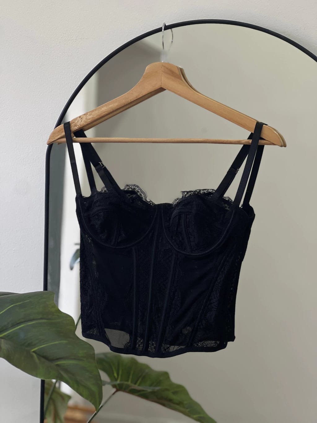 Bralette/Corset de microtul con detalles en puntilla. Color negro. Talle M (90/95)