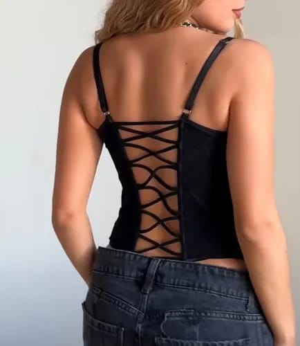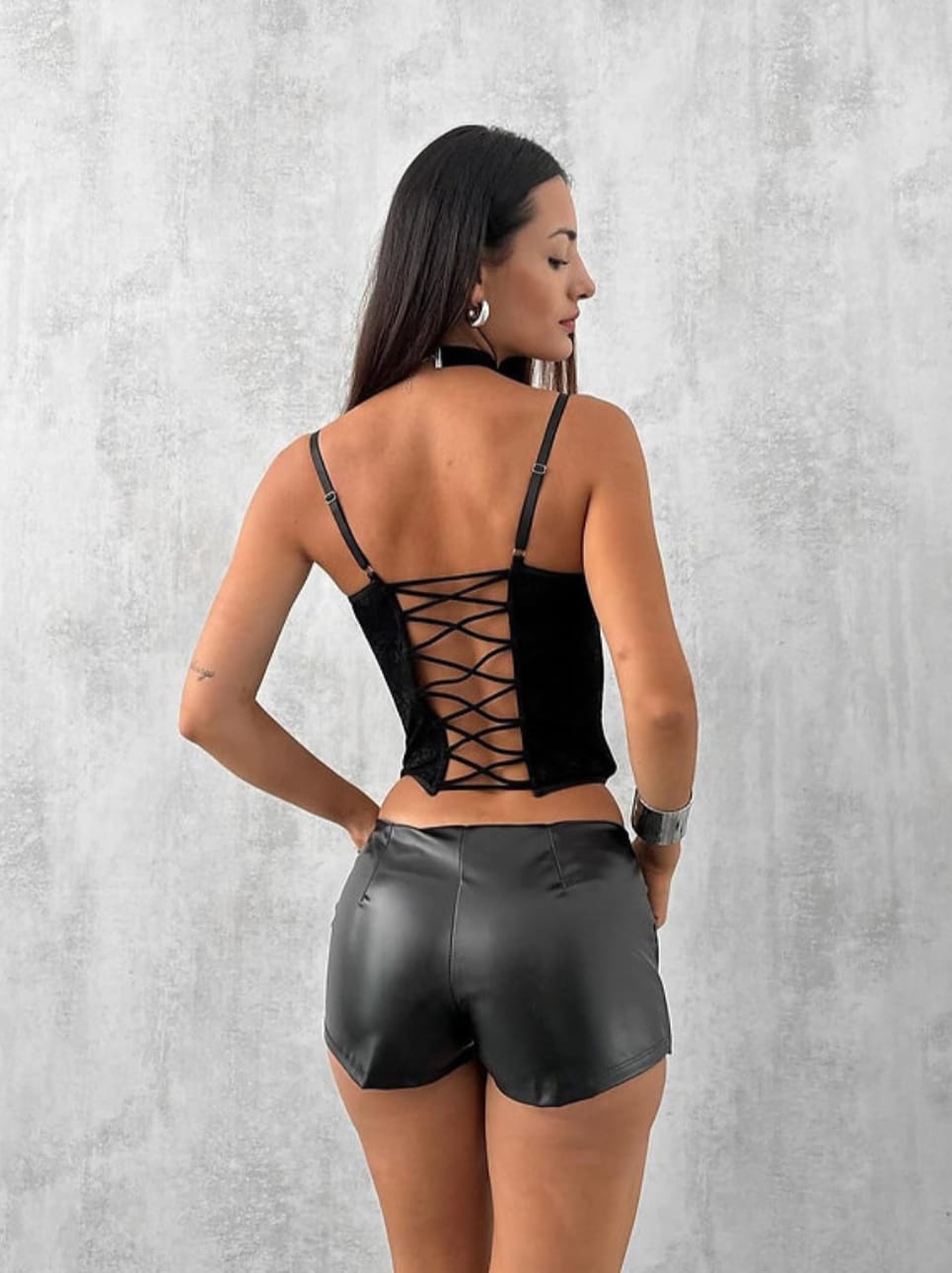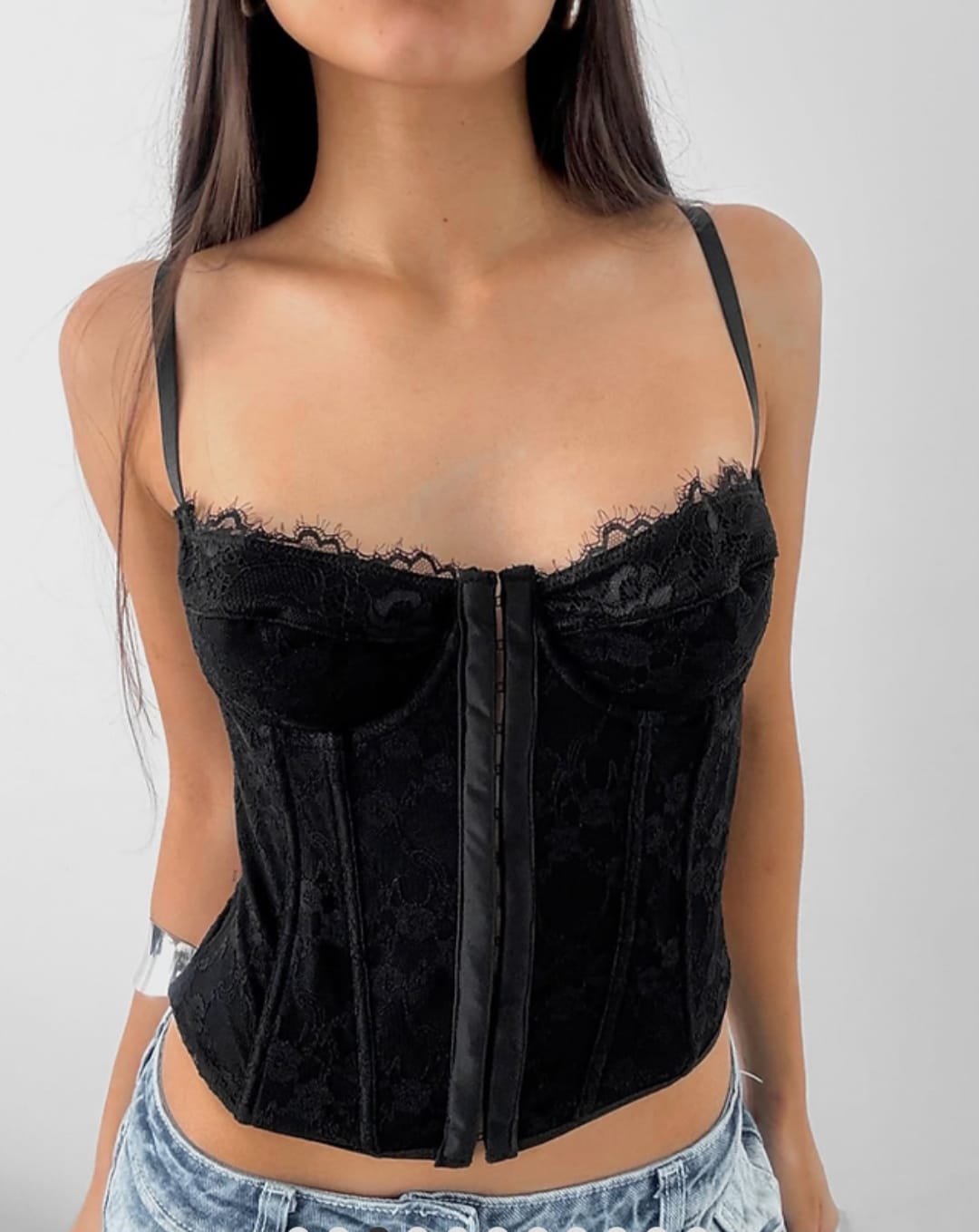 Bralette o Corset en color negro de total encaje con arco. Espalda con elástico y prendedor en parte delantera.