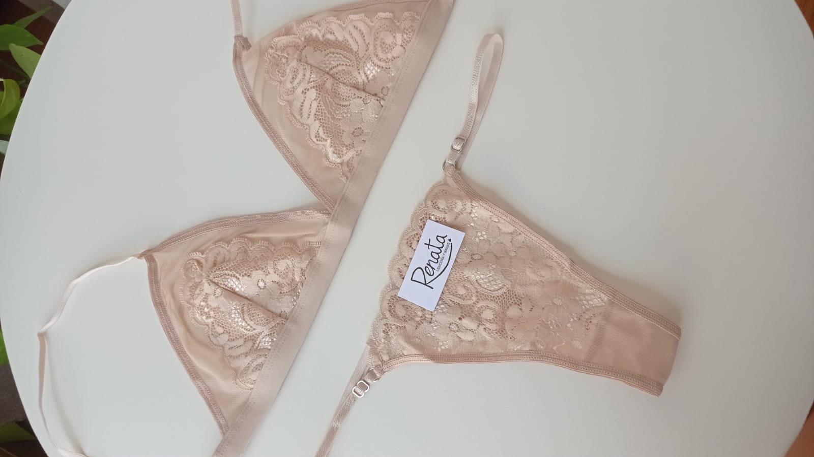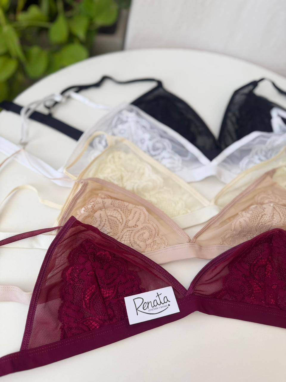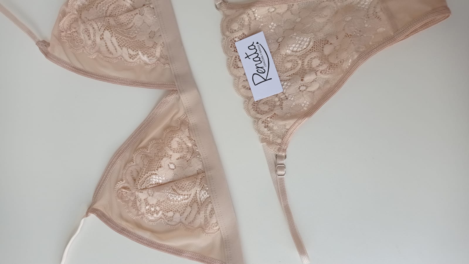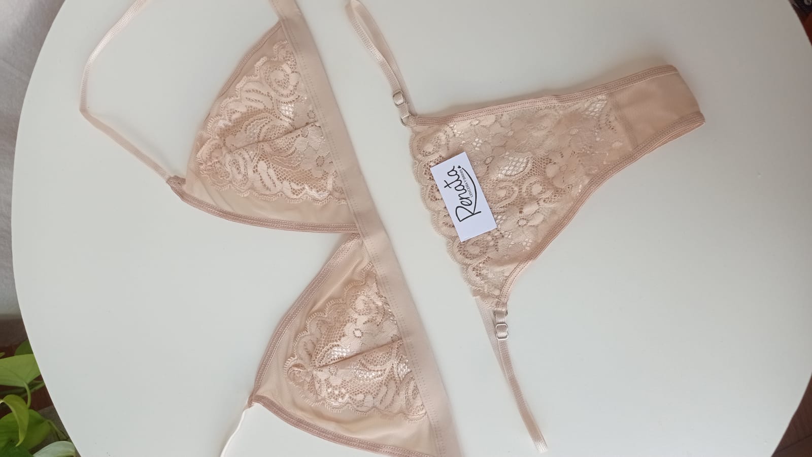 Conjuntos de corpi triangulito + less regulable. Tela microtul con detalles en puntilla.