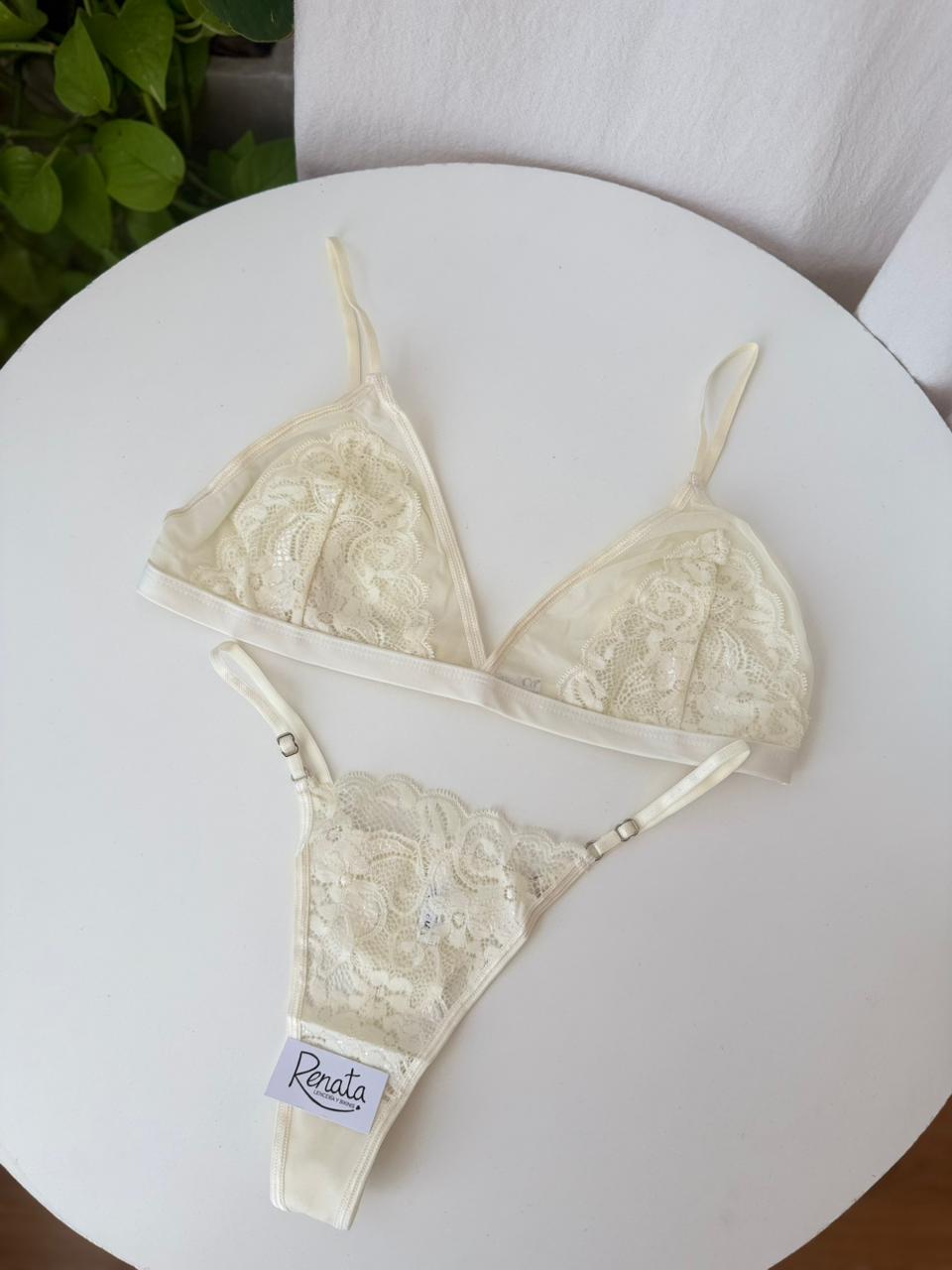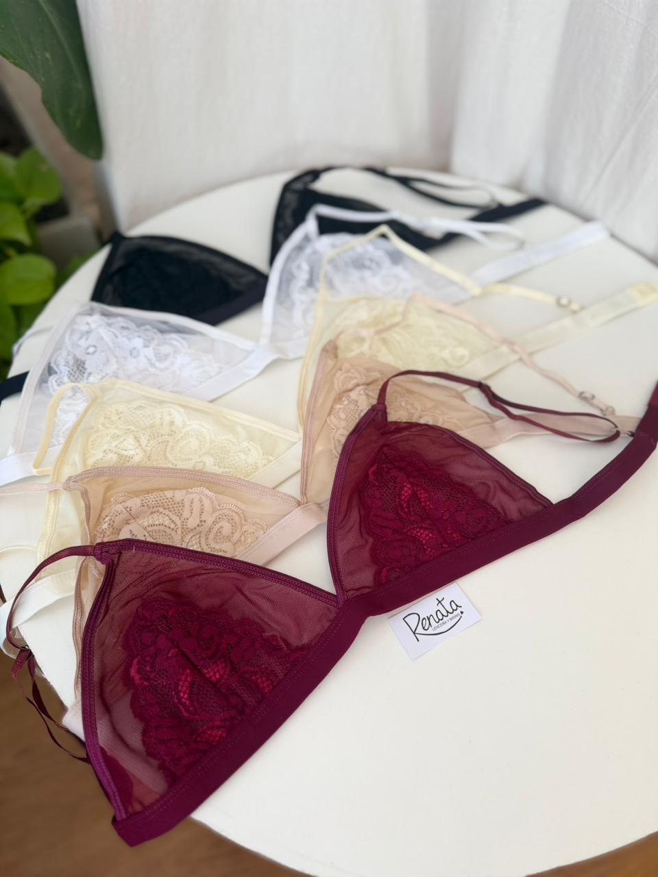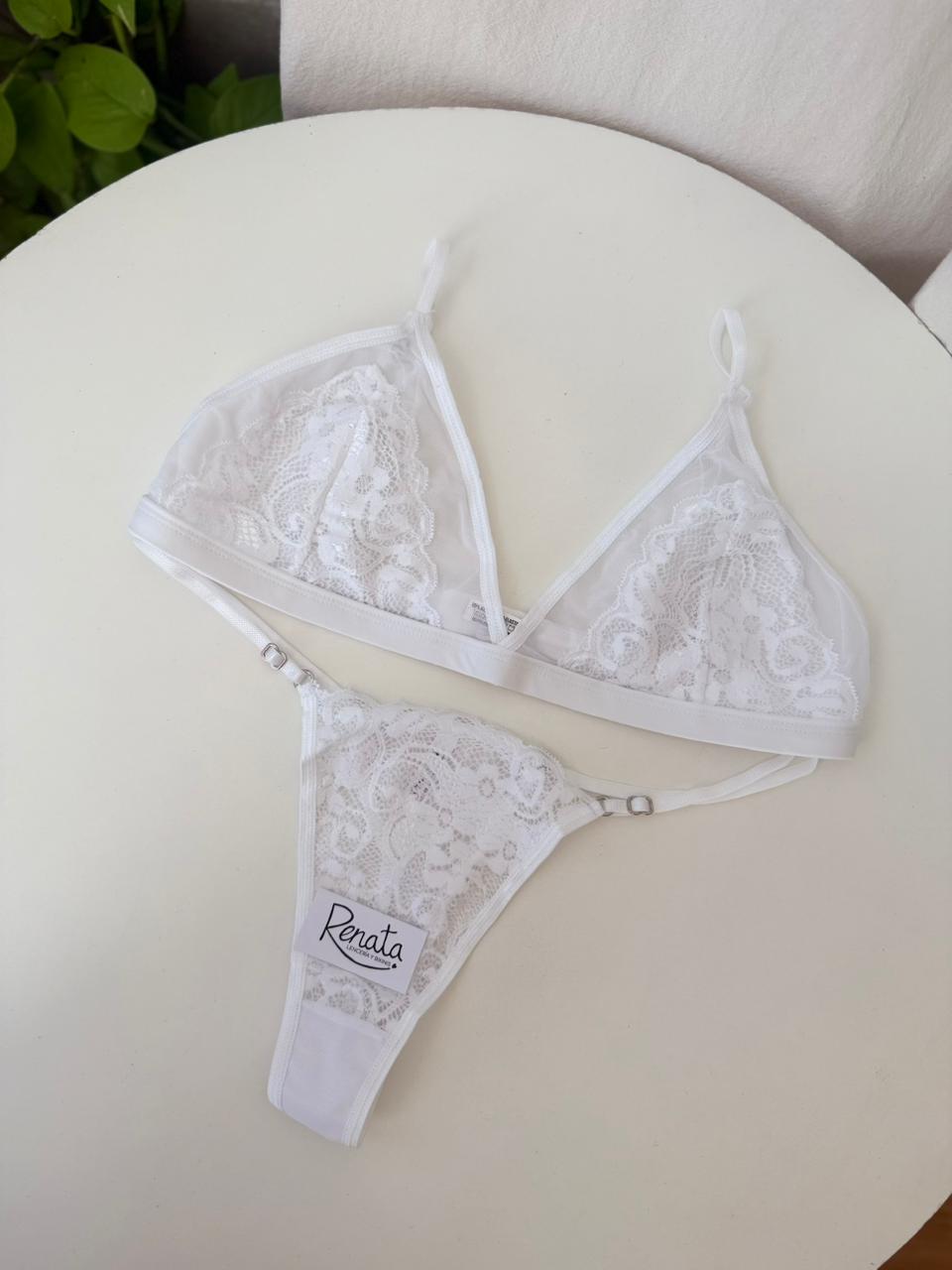 Conjuntos de corpi triangulito + less regulable. Tela microtul con detalles en puntilla.