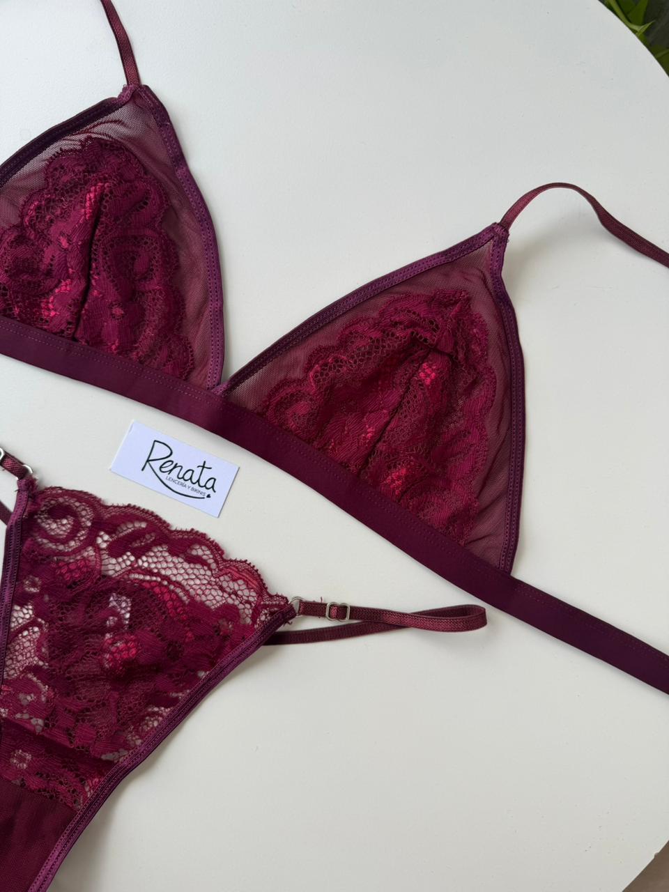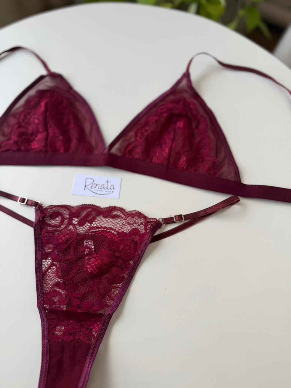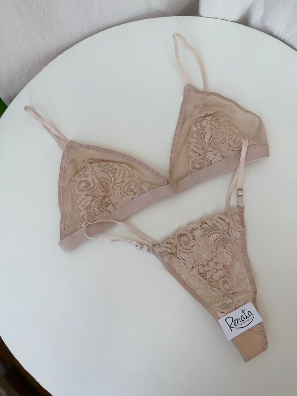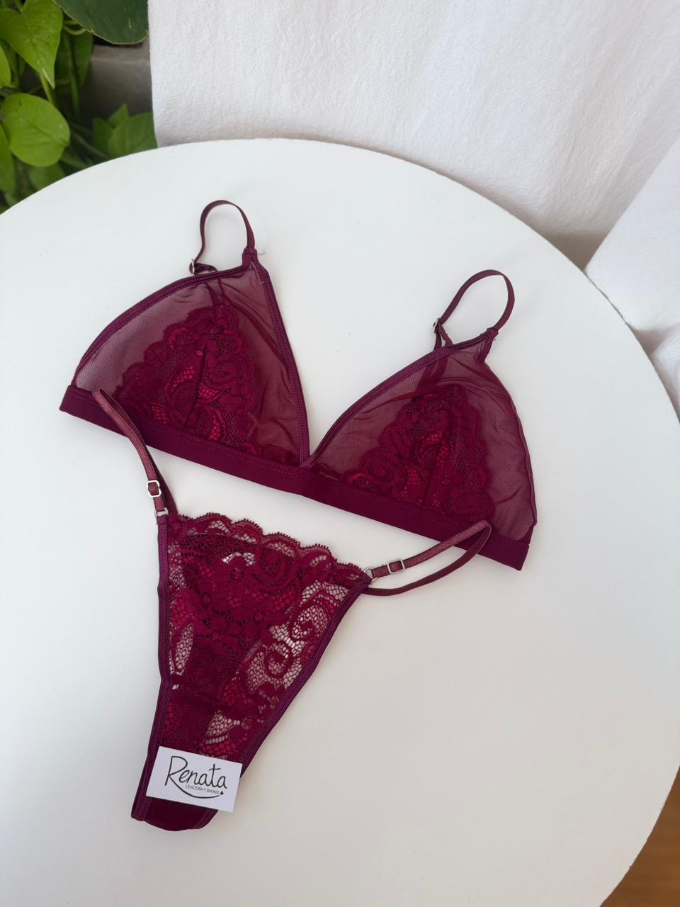 Conjuntos de corpi triangulito + less regulable. Tela microtul con detalles en puntilla.