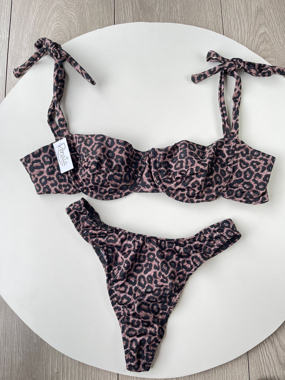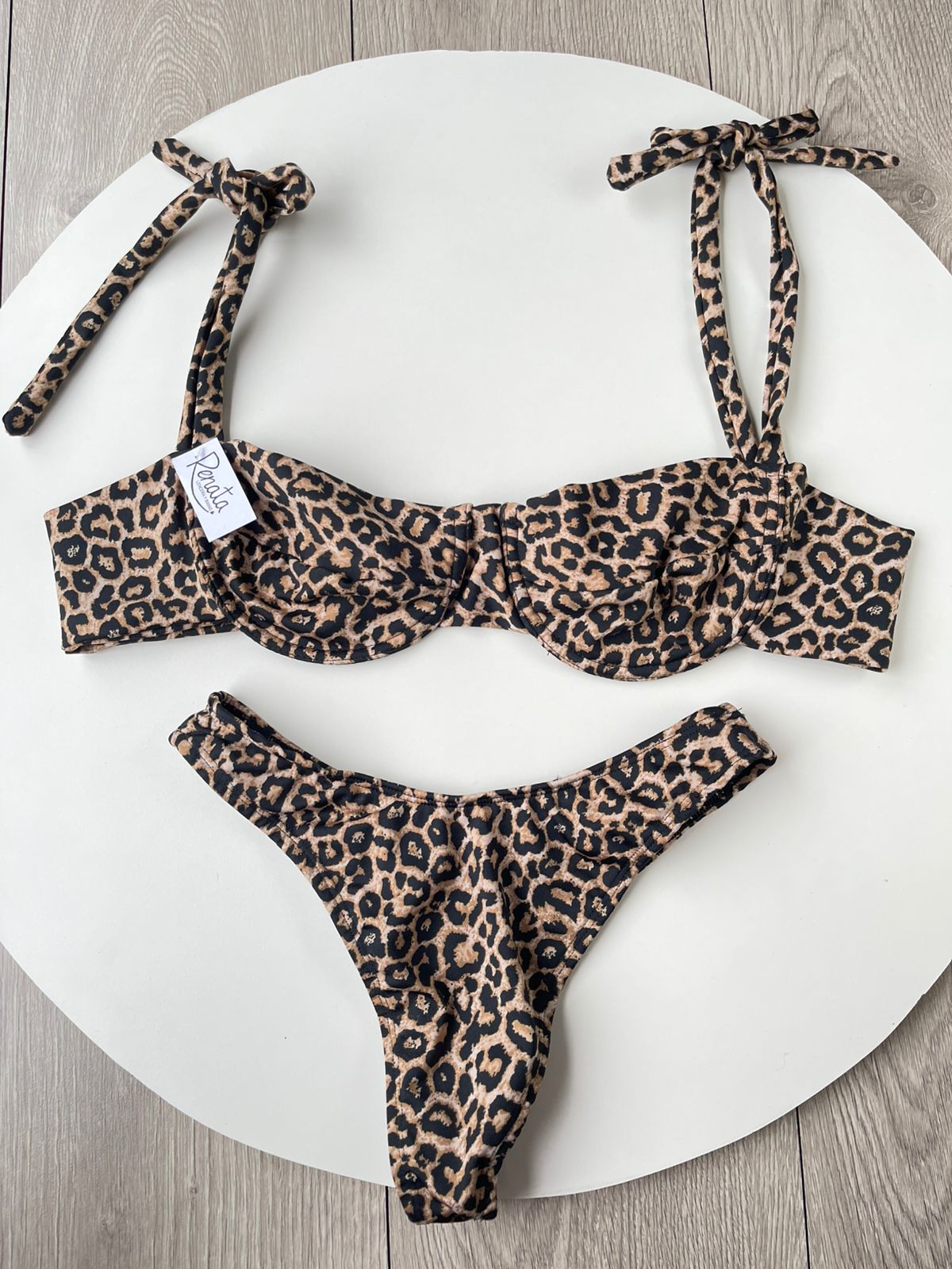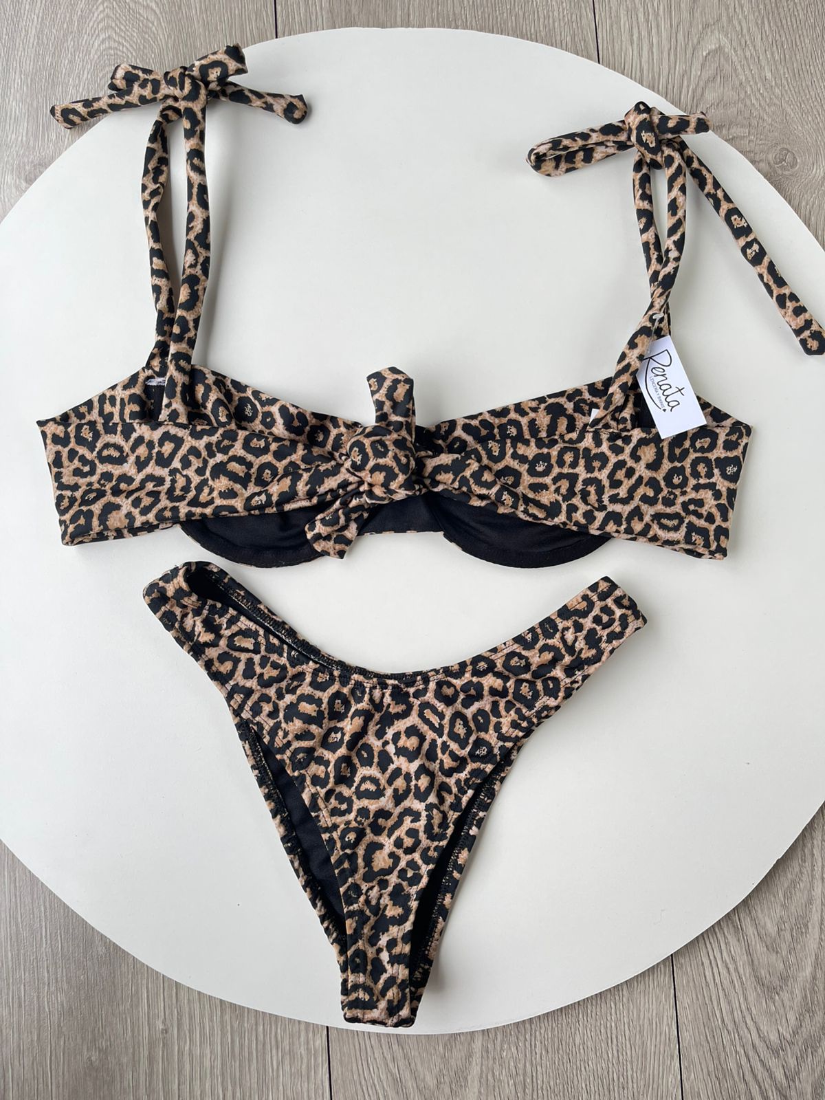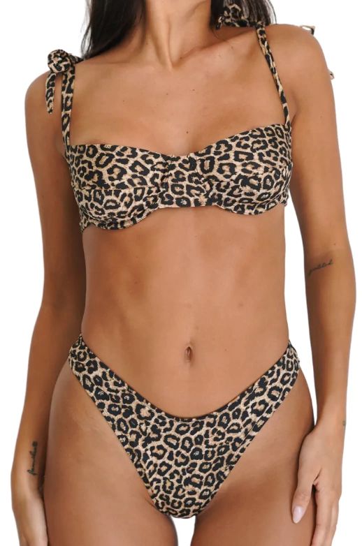 Confeccionado en tela Tricot, bikini que cuenta con un corpiño con aro y tiras para atar, con bombacha tiro alto tipo colaless. Ideal par la Playa y Pileta. Viene con un estampado de Animal Print